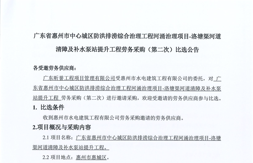 廣東省惠州市中心城區地下管網系統提升工程-內街小巷排水管網病害修復及錯混接改造項目一期施工勞務采購比選公告……